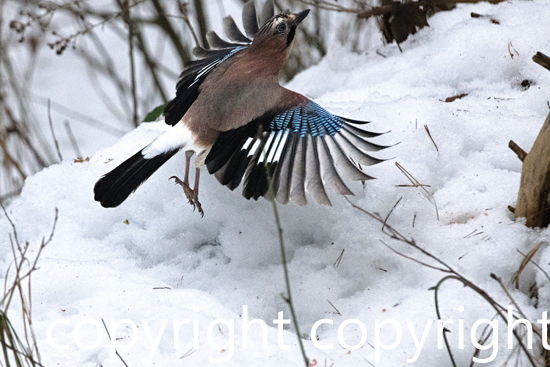 Eichelhäher im tiefen Winter auf Futtersuche